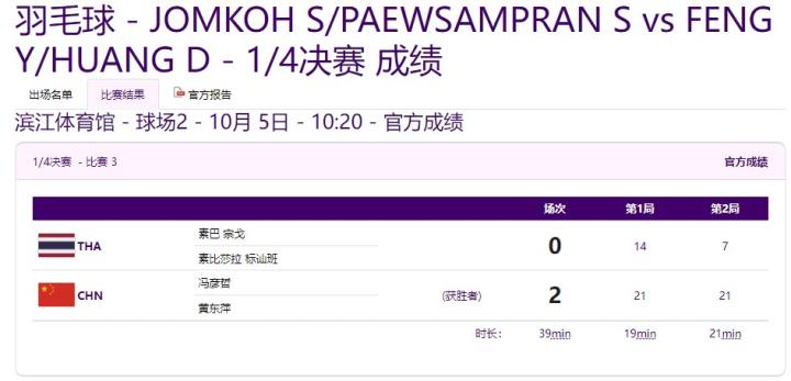 亚运羽毛球混双1/4决赛:冯彦哲/黄东萍击败泰国组合晋级四强德鲁飞鱼 @懂球帝2023-10-05 14:10北京时间10月5日进行的杭州亚运会羽毛球混双1/4决赛,中国组合冯彦哲/黄东萍直落两盘击败泰国组合苏柏克/苏皮萨拉,晋级四强。第一局比赛冯彦哲/黄东萍以21-14取得胜利,随后他们再以21-7拿下第二局。国羽混双两对组合郑思维/黄雅琼和冯彦哲/黄东萍均晋级四强,由于身处不同半区,所以国羽两对组合很有可能在决赛相遇。展开更多