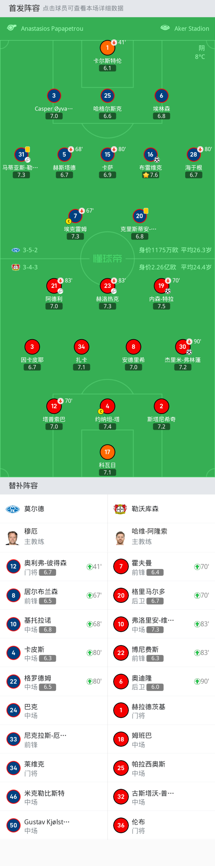 莫尔德首发:7-埃克雷姆, 28-海于根, 5-赫斯塔德, 6-埃林森, 20-克里斯蒂安-埃里克森, 1-卡尔斯特伦, 15-卡萨, 25-哈格尔斯克, 16-布雷维克, 3-Casper Øyvann, 31-马蒂亚斯-勒维克