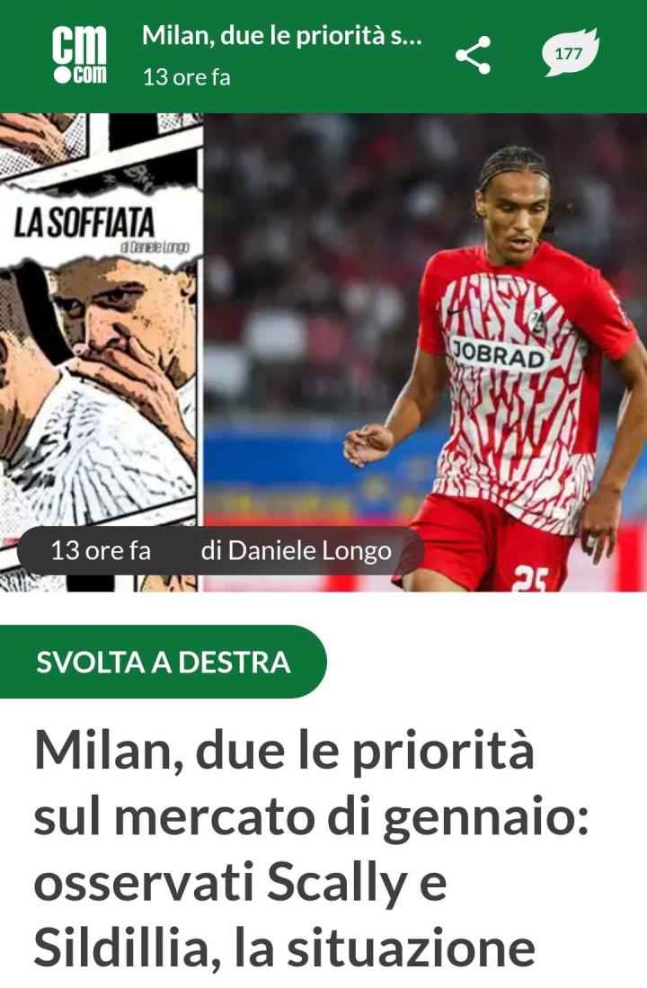 隆戈:冬窗补强右后卫,米兰正在评估弗赖堡的西尔迪利亚和门兴的约瑟夫-斯卡利 米兰在多特蒙德度过的遗憾夜晚让一些老问题再次浮出水面,红黑军团在一些位置上需要高水平的替代者,比如右后卫和中锋。米兰管理层在夏窗努力提升球队的阵容,但在一个转会窗内完成阵容的全面升级是不可能的。 在过去几周,米兰的球探已经在德国开始行动。有两名球员是他们重点关注的目标,他们将在接下来的比赛中继续进行评估:一位是出生于2002年的法国球员、弗赖堡右后卫西尔迪利亚;另一位同样出生于2002年、也是穆萨和普利希奇的国家队队友、门兴右后卫约瑟夫-斯卡利。 蒙卡达和奥塔维奥已经在为即将到来的冬窗制定战略,他们将对左边后卫和右边后卫进行一次真正的尝试。而在锋线上,他们正在研究里尔的乔纳森-戴维和其他一些球员。