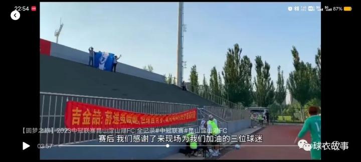 他还说淀山湖的球迷很多,农民,工人,老板,居民不同职业不同岗位的人都会来看球,于是在出征前昆山淀山湖的官方抖音里出现了一条来自保洁阿姨的祝福,她的脸上有着些许面对镜头的羞涩,有着一些记不住口号的吃力,还有一抹发自肺腑的微笑,以及结尾那一下带着希望的振臂。我并不了解这位阿姨与球队的故事,就像我还没有去过淀山湖触摸到他们球迷的感同身受。但是这每一个故事里的一丝一毫,都是真实发生的,我无法从中剖析出什么,也无法说这样小小的碎片会在中国足球这浩瀚的空间里闪烁或者折射出怎样的光彩,我能做的就是记录下来,把字写在纸上,把字刻在石头上,也许总是好的。