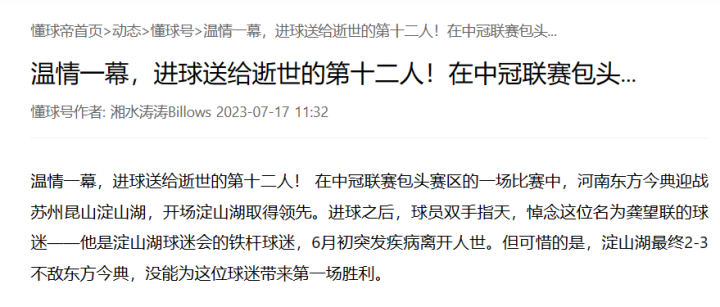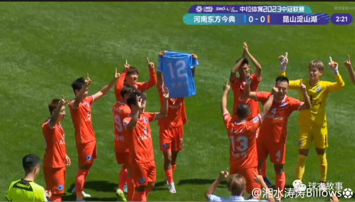 那是昆山淀山湖的第一场中冠比赛,对阵河南东方今典的第二分钟淀山湖7号沈威在禁区外一脚世界波弧线直挂死角,进球后全队冲向替补席,举起一件蓝色的球衣,随后双手指天。这一幕令我有些惊愕,还是第一次在中冠赛场上看到如此的场景。而后来通过湘水涛涛的懂球号才了解到是为了纪念一位去世的球迷。