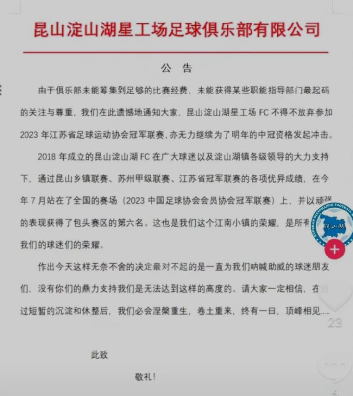 2023年8月23日,是昆山淀山湖官方抖音号宣布球队今年无法征战今年苏冠联赛也就宣告无缘24中冠的日子;2023年9月30日,是这篇文章发布的日子,两者相距38天。