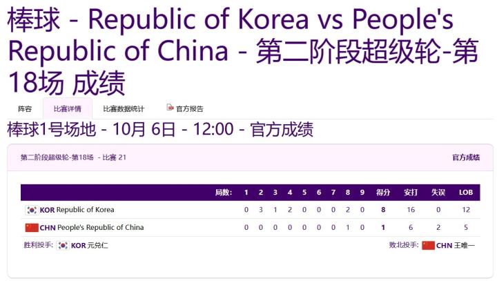 亚运会男子棒球第二阶段超级轮:中国1-8不敌韩国ZeroTsu_02 @懂球帝2023-10-06 15:55北京时间10月6日,杭州亚运会男子棒球第二阶段超级轮,中国1-8不敌韩国。男子棒球第二阶段超级轮,中国1-8不敌韩国,超级轮比赛结束,接下来进入奖牌争夺战,韩国将与中国台北争夺亚运金牌,中国将再遇日本,争夺亚运会奖牌席位。展开更多