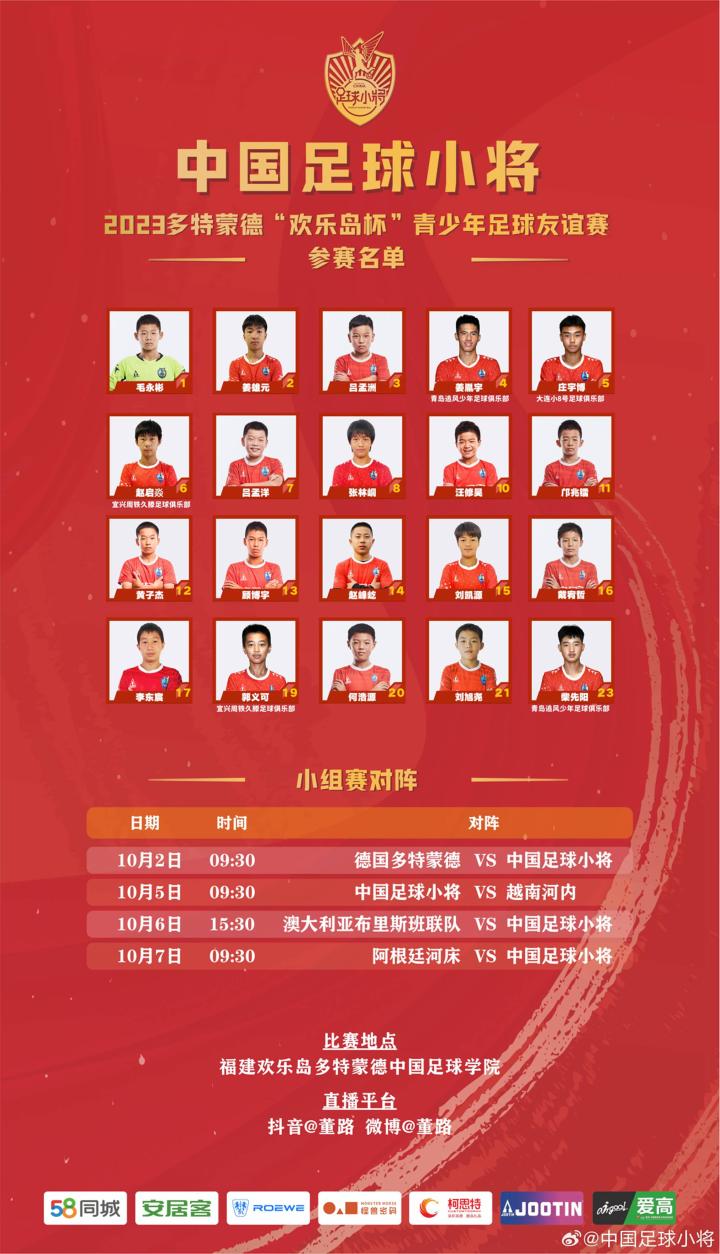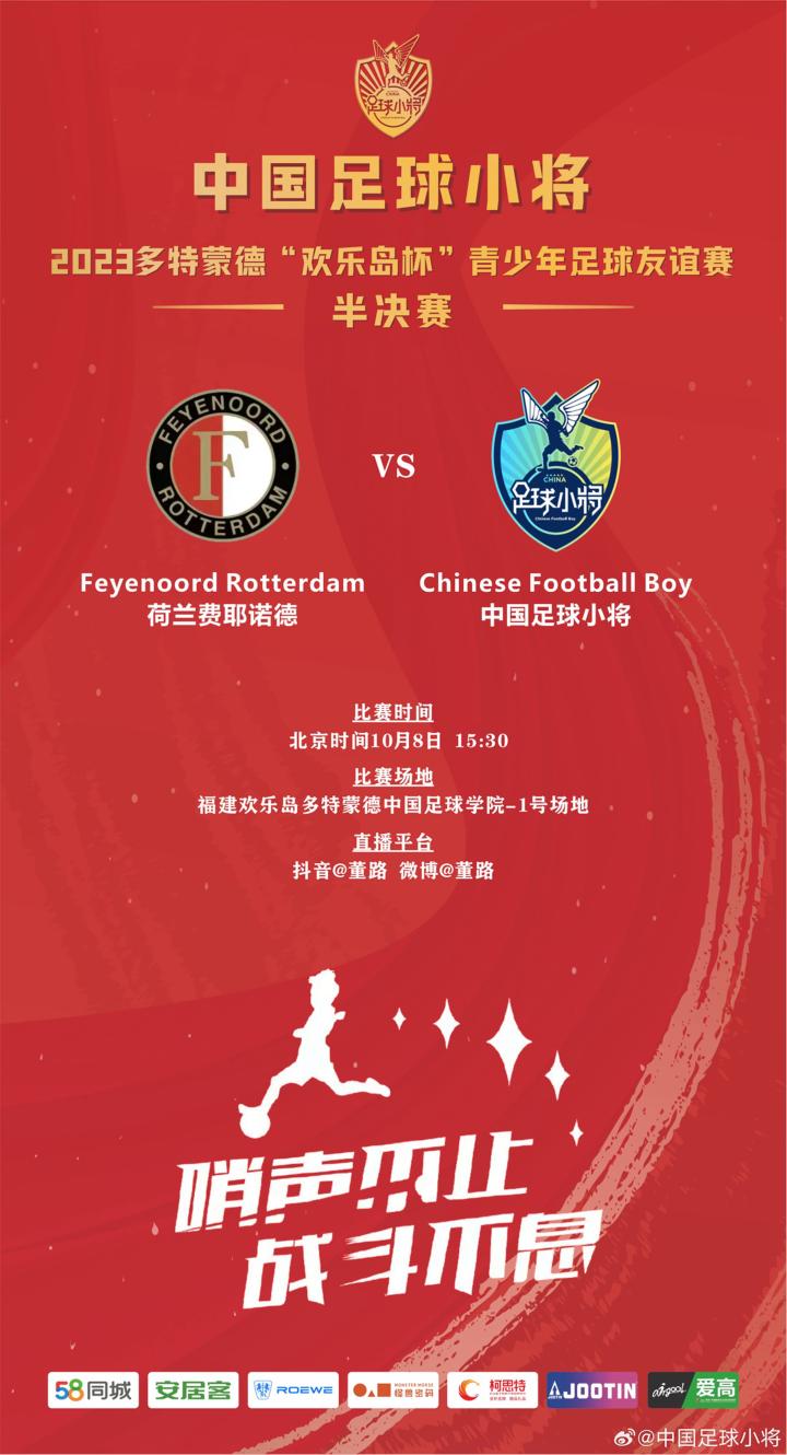 北京时间10月8日 15.30,2023 多特蒙德“欢乐岛杯”青少年足球友谊赛半决赛,中国足球小将对阵荷兰费耶诺德,让我们一起为中国足球小将加油!为姜胤宇加油!