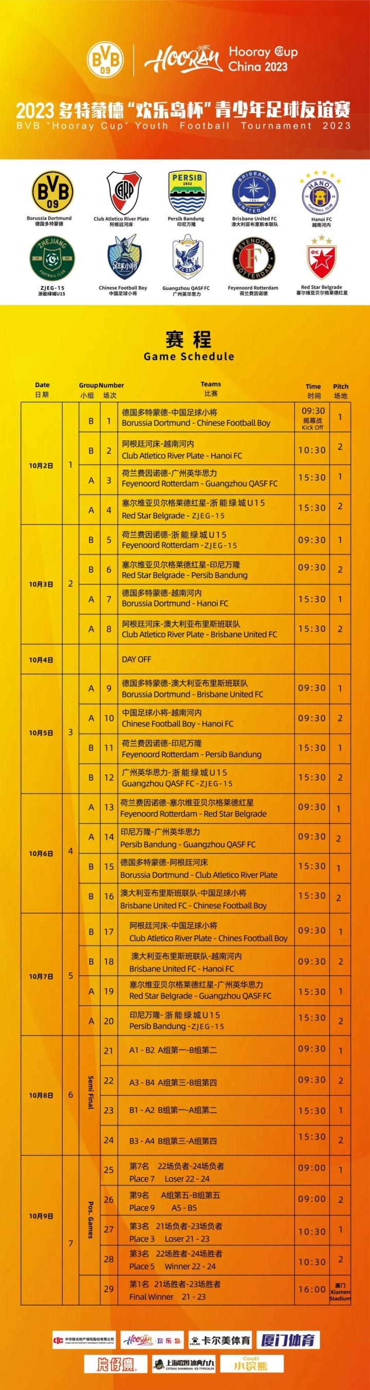 2023 多特蒙德“欢乐岛杯”青少年足球友谊赛10月2日—8日在福建漳州欢乐岛国际足球训练基地举行!该项赛事设置为U15年龄段,德国多特蒙德、阿根廷河床、印尼万隆、澳大利亚布里斯本联队、越南河内、荷兰费因诺德、塞尔维亚贝尔格莱德红星,以及浙江职业足球俱乐部、中国足球小将、广州英华思力集结的10支国内外顶尖球队参赛。据了解,此次来华参赛的多特蒙德U15梯队是德国该年龄段冠军球队。