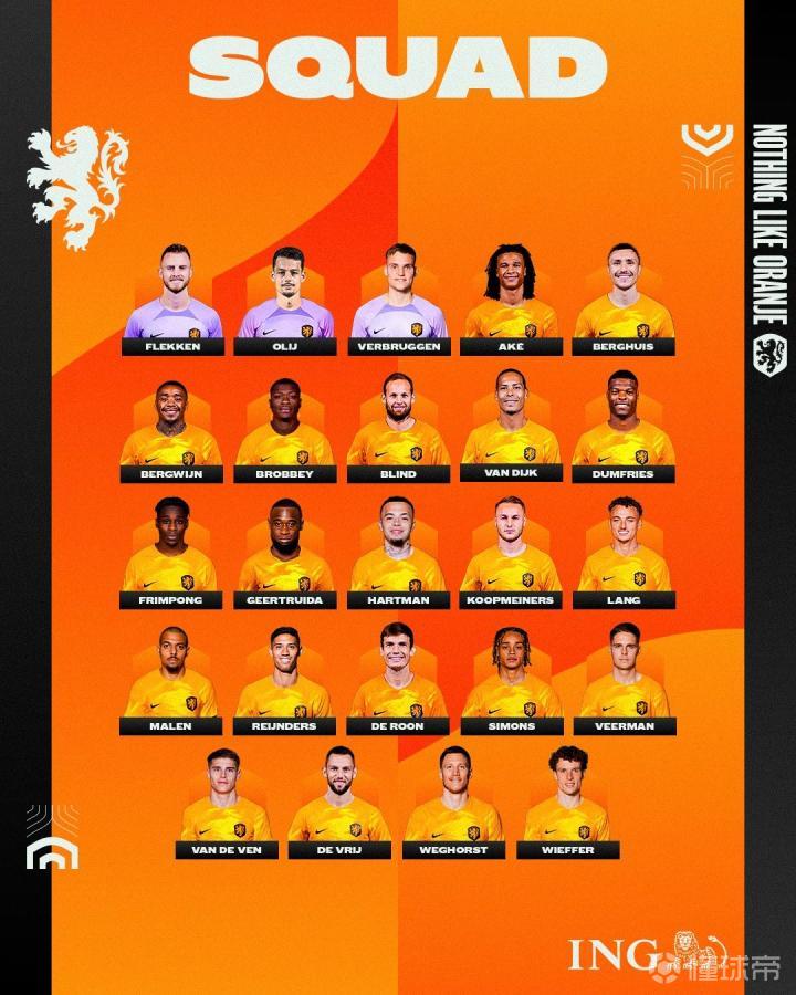 后卫:阿克、布林德、范戴克、邓弗里斯、弗林蓬、海特勒伊达、哈特曼、范德芬、德弗赖