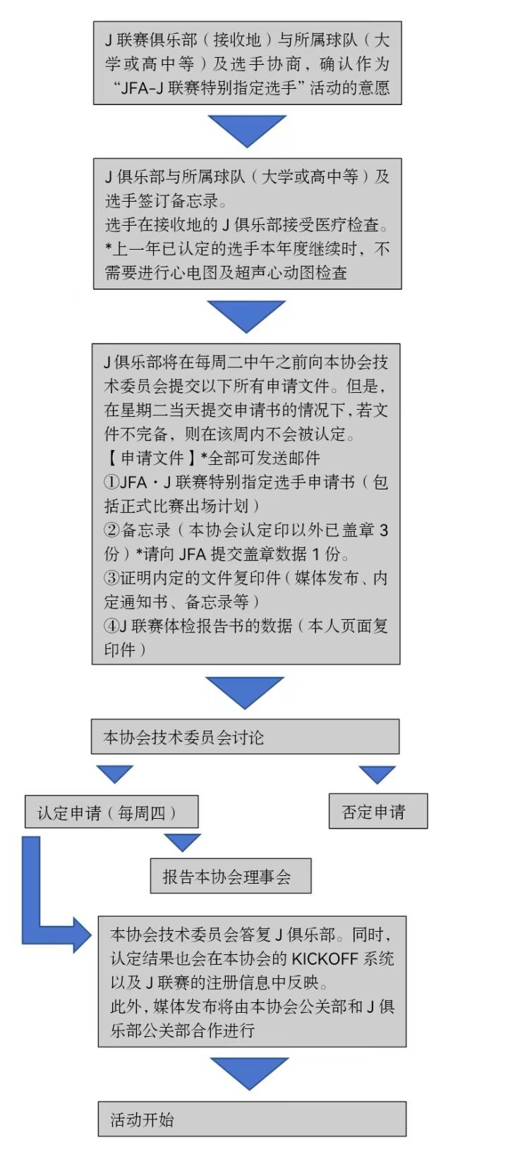 作为接收方的J联赛俱乐部,需要按照下述规定的手续,与该选手所属的球队(大学或高中等)以及选手本人(*选手未成年的情况下也需要监护人的同意)各方达成协议后,向本协会技术委员会提交特别指定选手的申请。但是,所属队伍(大学或高中等)是“与大学足球部相同标准的球队”或“一般青年队”的情况,还必须与该选手实际就读学校达成协议。