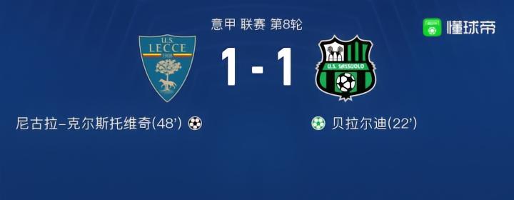 北京时间10月07日意甲 联赛 第8轮,莱切主场对阵萨索洛。莱切尼古拉-克尔斯托维奇破门。萨索洛贝拉尔迪破门。最终比分1-1。