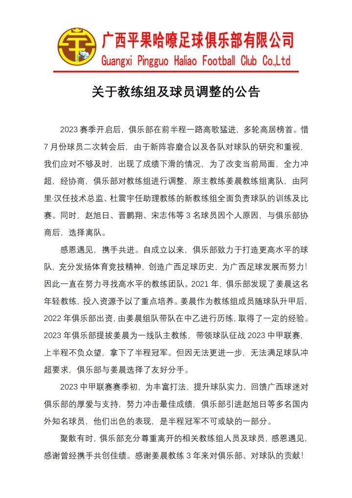 赵旭日、姜晨离队!广西平果哈嘹关于教练组及球员调整的公告