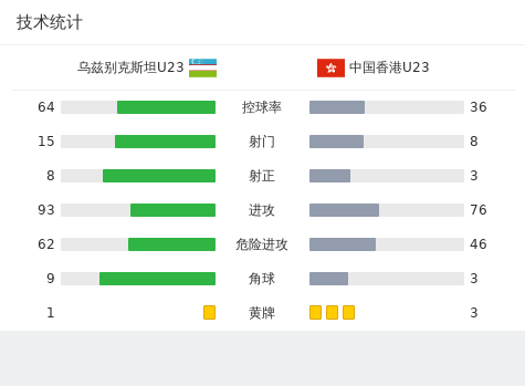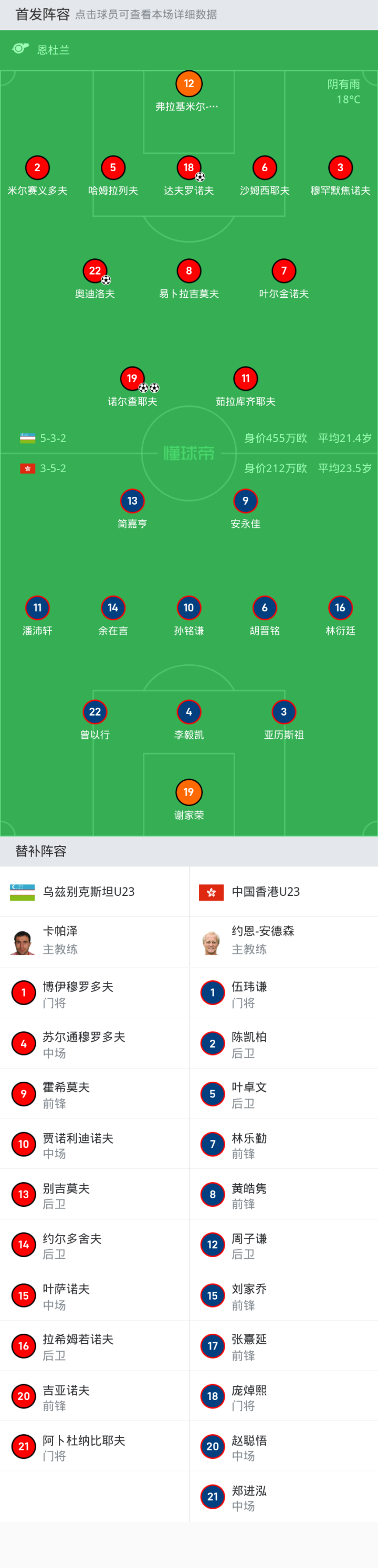 乌兹别克斯坦U23首发:7-叶尔金诺夫, 8-易卜拉吉莫夫, 6-沙姆西耶夫, 2-米尔赛义多夫, 19-诺尔查耶夫, 11-茹拉库齐耶夫, 18-达夫罗诺夫, 12-弗拉基米尔-纳扎罗夫, 22-奥迪洛夫, 5-哈姆拉列夫, 3-穆罕默焦诺夫