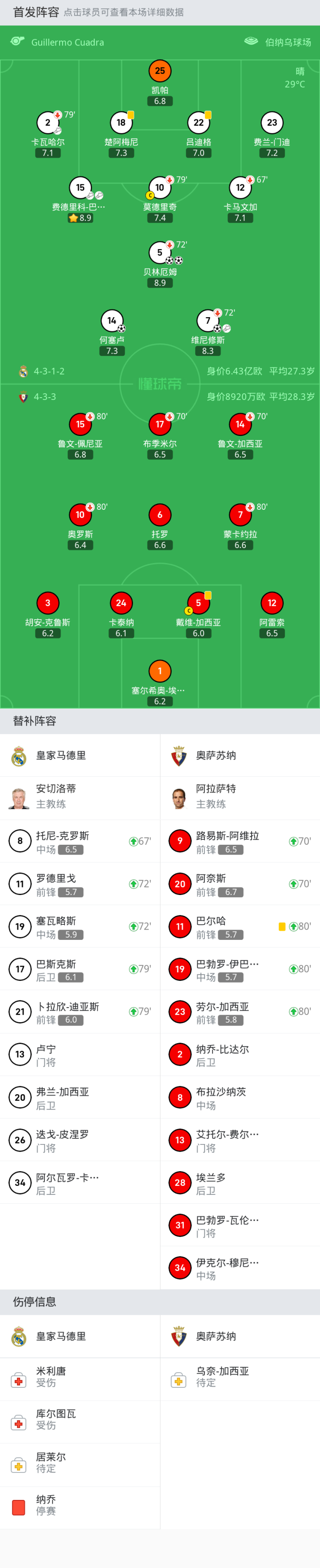 替换下场:79'10-莫德里奇, 79'2-卡瓦哈尔, 72'7-维尼修斯, 67'12-卡马文加, 72'5-贝林厄姆