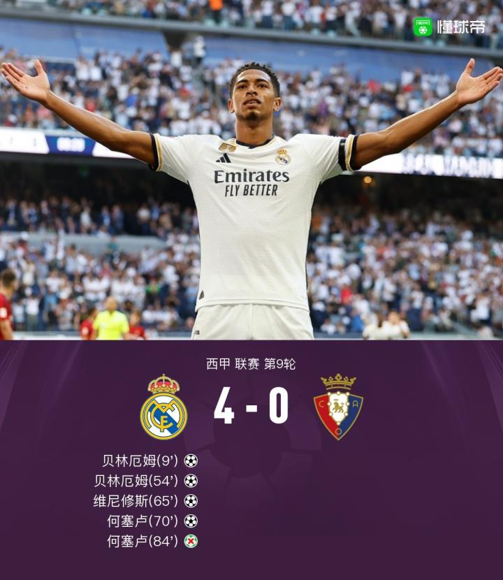 北京时间10月7日22:15,西甲第9轮继续进行,皇家马德里坐镇主场伯纳乌球场迎战奥萨苏纳,本场主裁判为夸德拉-费尔南德斯。上半场,卡瓦哈尔回做助攻贝林厄姆破门。下半场,贝林厄姆再入一球上演梅开二度,维尼修斯传射建功,何塞卢破门+失点,巴尔韦德助攻双响。最终,皇马主场4-0大胜奥萨苏纳。