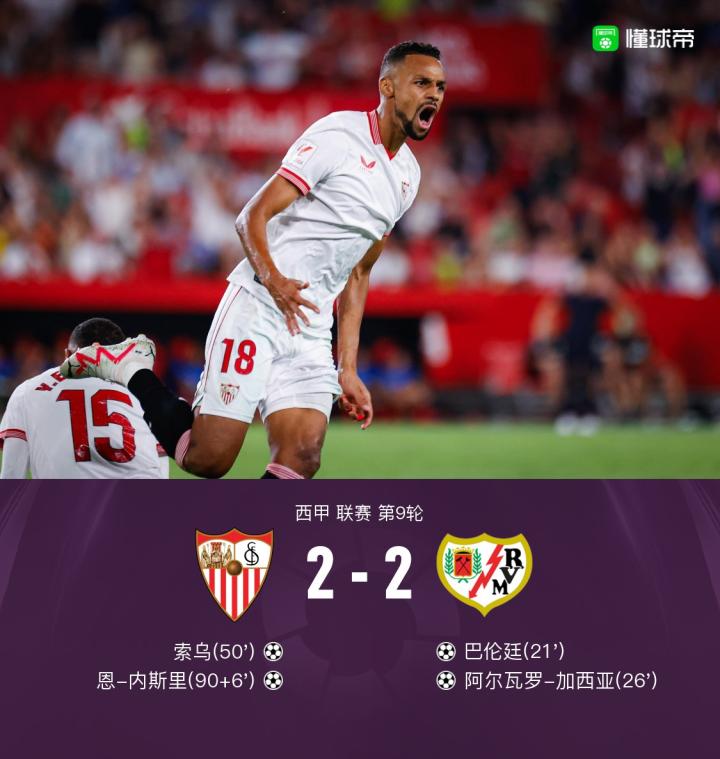 塞维利亚两球落后2-2巴列卡诺,恩-内斯里读秒绝平