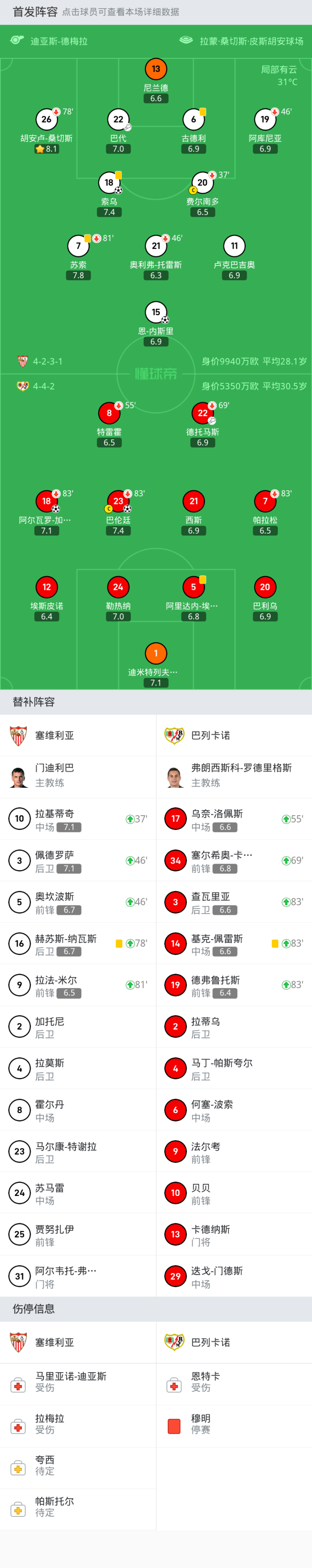 替换下场:37'20-费尔南多, 46'19-阿库尼亚, 81'7-苏索, 46'21-奥利弗-托雷斯, 78'26-胡安卢-桑切斯