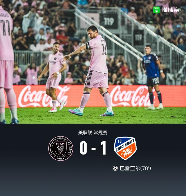 北京时间10月8日上午7:30美职联常规赛,迈阿密国际主场对阵辛辛那提。上半场,迈阿密国际阿维莱斯、约瑟夫-马丁内斯与克雷马斯基先后击中门框,半场双方0-0战平,下半场,比赛第55分钟,梅西伤愈复出替补登场,比赛第78分钟,卡伦德扑出远射后,巴雷亚尔补射破门。最终比分迈阿密国际主场0-1辛辛那提,连续5场不胜的同时无缘季后赛。