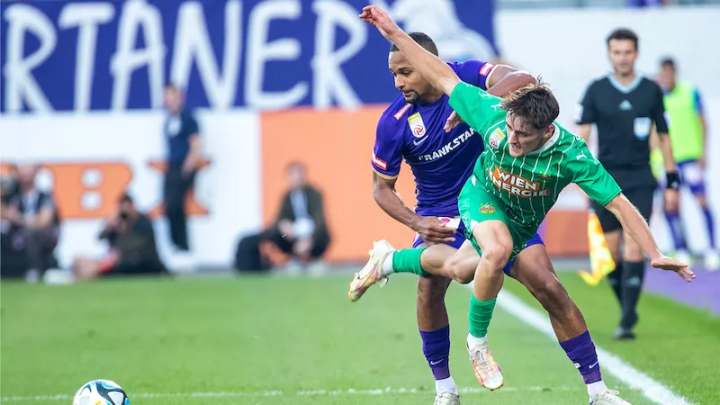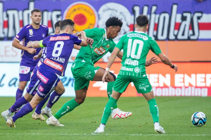 尤其是在开场阶段,他们的紧张情绪十分明显,球队一次又一次地陷入混乱。一个很好的例子是,兰夫特在面对尼古拉斯·库恩的跑动中几乎回传了一个致命的球,门将福吕希特尔不得不在最紧急的情况下将球扑出。在格鲁比尔的头球攻门扩大比分后,早早取得的领先优势仅以毫厘之差被判无效。不过,我们也可以冷嘲热讽地指出,考虑到过去三周,奥地利维也纳在早早领先的情况下总是仍然无法取胜,这对紫罗兰队来说无论如何都不是优势。直到过了20到25分钟,他们才稍稍冷静下来,进入比赛节奏。这也是因为快速队越来越多地采取了观望态度,让紫罗兰队在中场进行了更深的压迫。