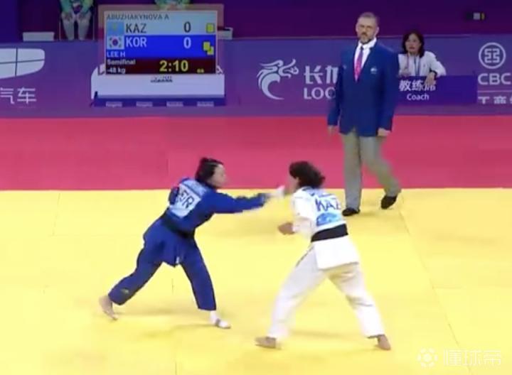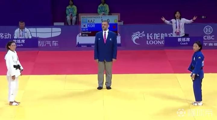 9月24日,亚运会柔道女子48公斤级半决赛,韩国运动员在比赛中直接扇到对手哈萨克斯坦选手的脸被罚出场。