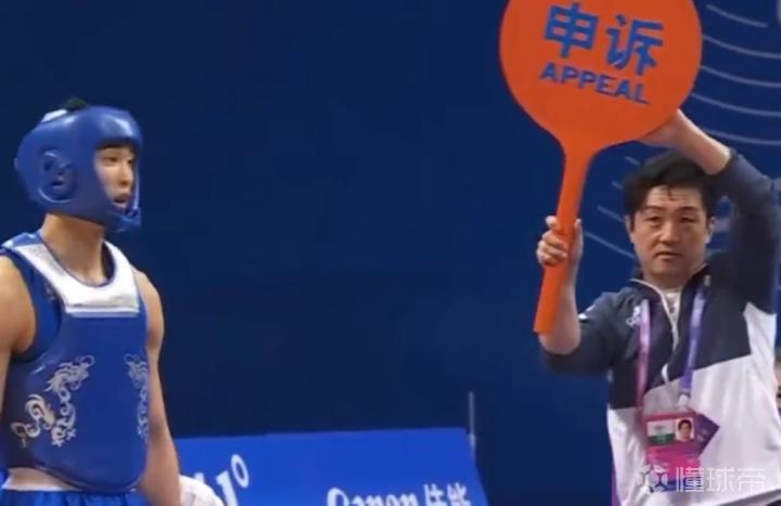 9月24日,亚运会散打1/8决赛,韩国选手宋基哲对阵伊朗选手。比赛过程中,韩国选手韩国队教练对第一局的比分裁定不满,本想举起“申诉”的牌子进行申诉。