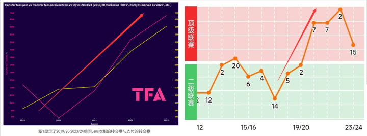 朗斯的进步无疑是一种良性循环,这张图基本能说明问题,球队成绩上升、转会收入和转会支出也是跟着一起提升。球队成绩稳定提升,主力被挖走,赚钱的同时,也持续提高阵容预算,找对位引援补强。不过本赛季初期,朗斯状态较为低迷,联赛前5轮1平4负,近期才找回节奏,先战平塞维,随后联赛两连胜+欧冠击败枪手,收获三连胜。赛季初期朗斯的低迷或许和人员变动、磨合有关,本赛季朗斯失去了两大绝对的核心,一个是当家射手奥蓬达,一个是中场核心福法纳,前者现在是莱比锡的大腿,后者在沙特联赛淘金。海瑟治下的朗斯,基本盘为3-4-3或者说是3-4-2-1,球队常规组织时的站位是两名边中卫拉到边线,两个翼卫顶上锋线,会留一名专职防守的中场,剩下一名8号位中场推进与串联,然后两个前腰走肋部。整体攻守非常平衡,同时鼓励球员跑动,防守也以把对手进攻赶向边路,同时找机会反抢发起反击。