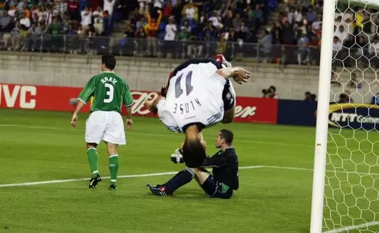 这场比赛是在日本的鹿岛体育场,德国队依旧排出克洛泽和比埃尔霍夫的双前锋组合。由于世界杯预选赛以及首场小组赛的惊艳表现,爱尔兰队对克洛泽“重点照顾”。爱尔兰的后卫芬南专门负责盯防克洛泽,甚至不惜采用犯规战术来阻止克洛泽对于球门的冲击。即便如此,克洛泽依旧能够凭借自己敏锐的跑动以及头球的表现去攻破爱尔兰的球门。