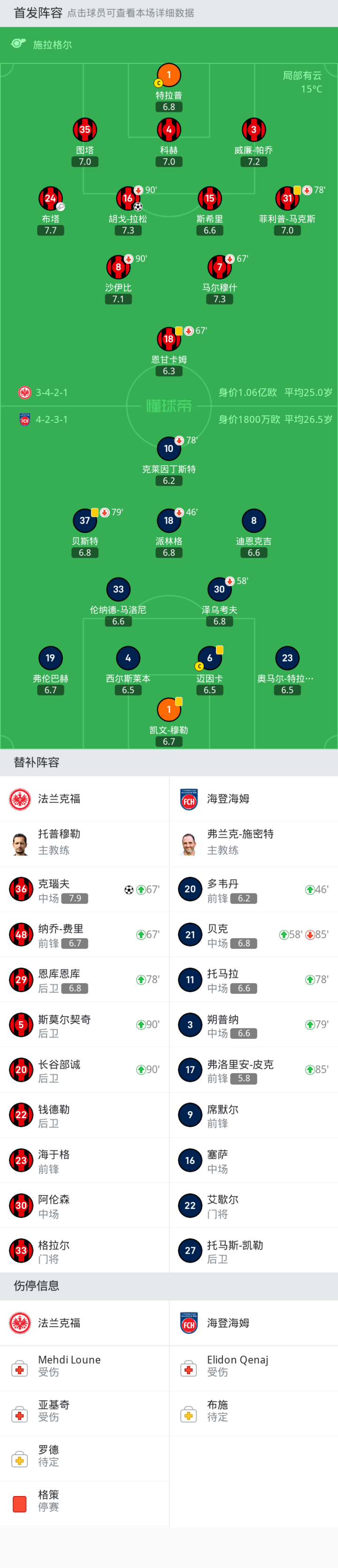 法兰克福首发:1-特拉普, 31-菲利普-马克斯, 15-斯希里, 24-布塔, 4-科赫, 7-马尔穆什, 18-恩甘卡姆, 35-图塔, 3-威廉-帕乔, 16-胡戈-拉松, 8-沙伊比