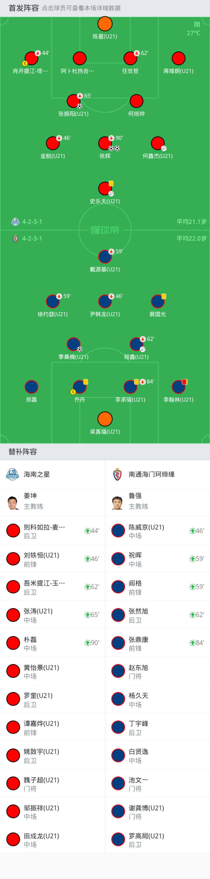 替换下场:46'60-尹韩龙(U21), 62'50-程鑫(U21), 59'42-徐约瑟(U21), 84'55-李承骏(U21), 59'59-戴源基(U21)