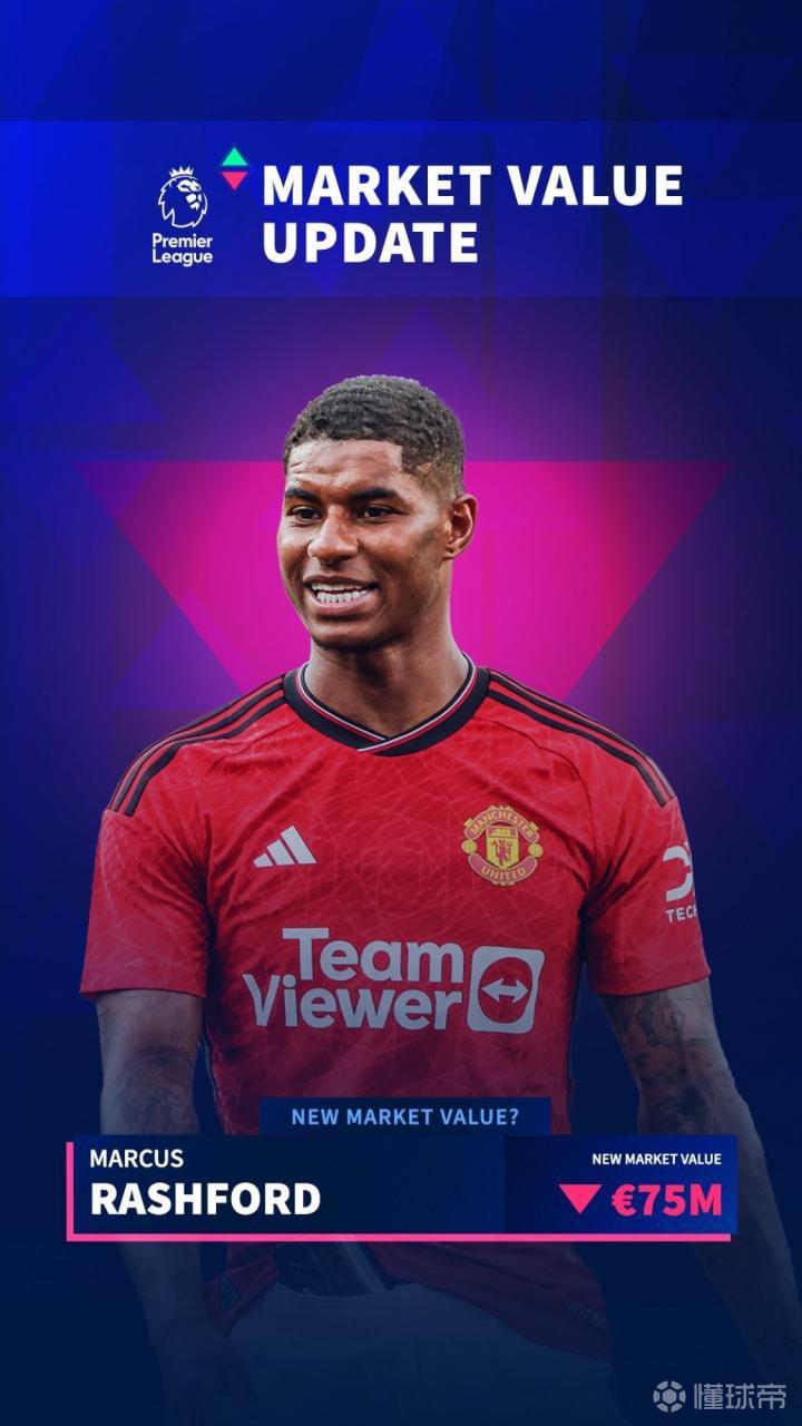 此外,曼联身价下跌的还有拉什福德,这位英格兰前锋身价下降500万欧至7500万欧。