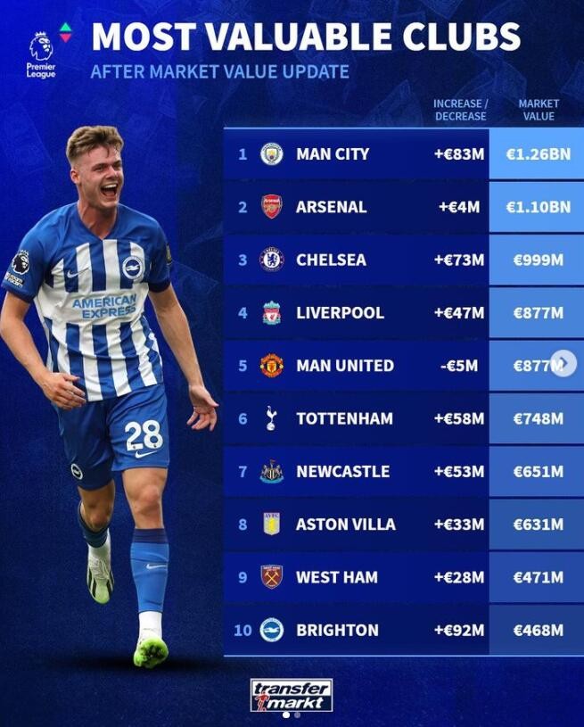 英超球队最新身价排名:曼城12.6亿欧第一,阿森纳第二