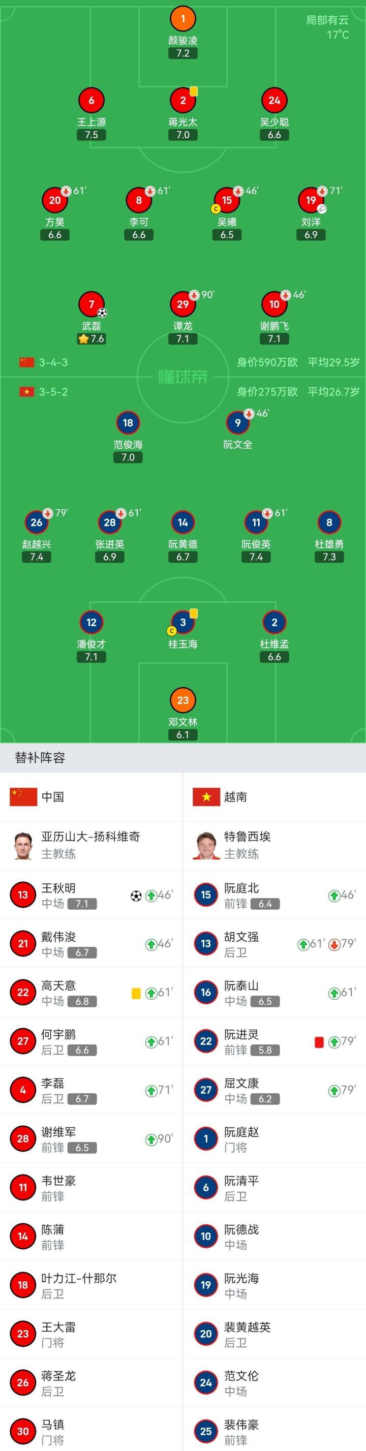 国足首发:1-颜骏凌、24-吴少聪、2-蒋光太、6-王上源、19-刘洋(71'4-李磊)、8-李可(61'22-高天意)、15-吴曦(46'13-王秋明)、20-方昊(61'27-何宇鹏)、10-谢鹏飞(46'21-戴伟浚)、7-武磊、29-谭龙(87'28-谢维军)