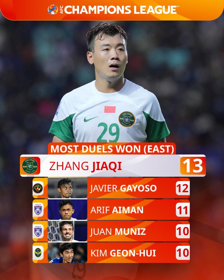 张佳祺是本赛季亚冠东区赢下对抗次数最多的球员,13次。