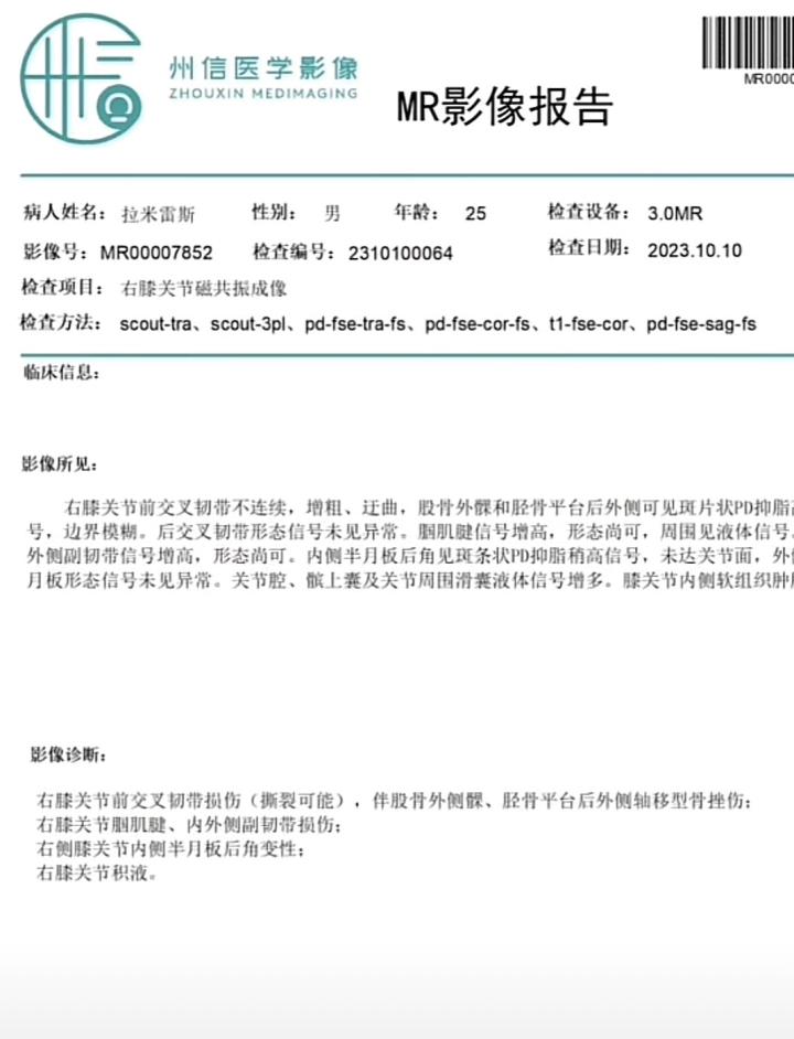 观海新闻记者史鉴晒出了拉米雷斯的检查报告