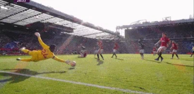 对阵水晶宫的丢球也是类似的原因。在一个相当接近球门的距离上,奥纳纳仍然下意识地准备做出双手扑球动作,导致起跳后的身体姿态相当怪异:下肢没有完全发力起跳,上肢也没有完全舒展。