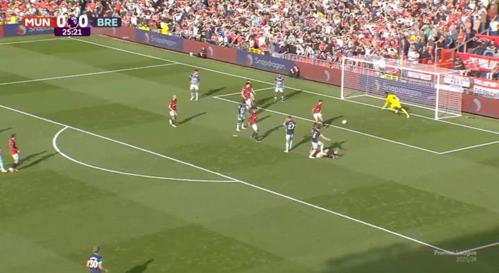 对阵布莱顿的第二个丢球,奥纳纳选择用双手进行扑救,做出一个类似排球拦网的动作。攻方视角显示,奥纳纳的手掌碰到了皮球,却难以阻止皮球入网。