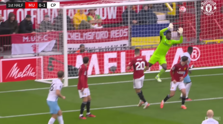 对阵水晶宫,奥纳纳犯了横移过头的错误。攻方视角显示,当安德森接球射门时,奥纳纳还有一个向球门中线右侧迈步移动的动作。目睹来球后,奥纳纳一个急停,导致重心分散,难以第一时间发力起跳。
