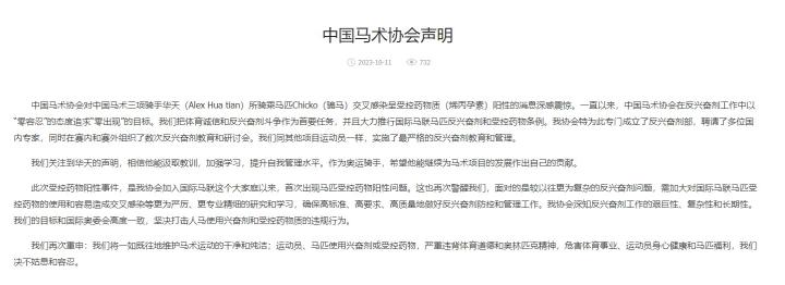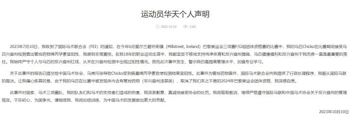 华天在声明中表示:今年6月爱尔兰磨坊街镇(Millstreet, Ireland)巴黎奥运会三项赛F/G组团体资格赛的比赛中,我的马匹Chicko在比赛期间接受马匹兴奋剂检测查出管控药物烯丙孕素呈阳性,我感到非常震惊。