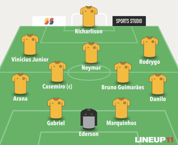 同昨日训练的首发阵容一致,阿拉纳顶替受伤的洛迪,罗德里戈去到右边替代受伤的拉菲尼亚,而伤愈复出的维尼修斯占据左路主力位置。