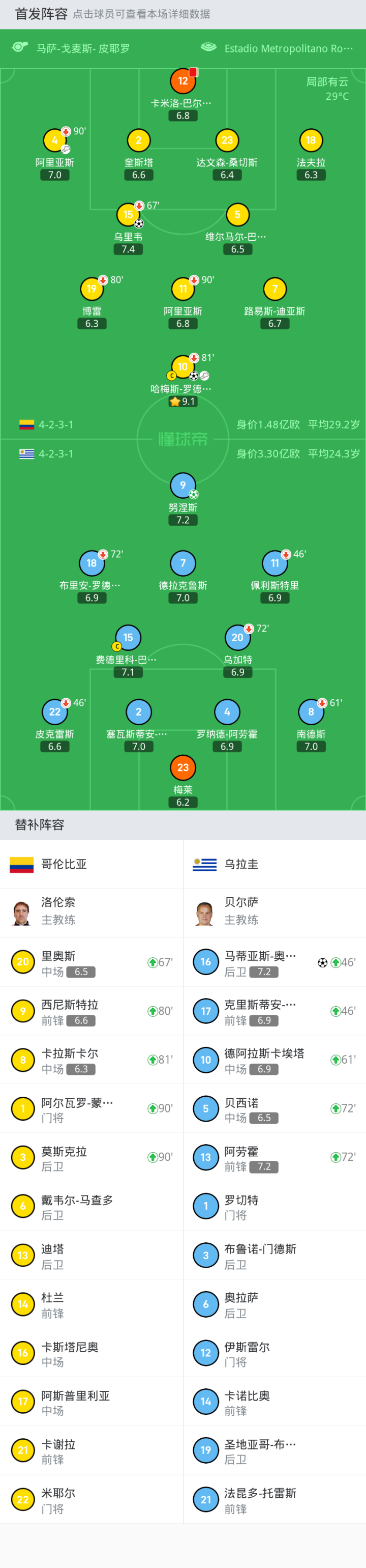 替换下场:81'10-哈梅斯-罗德里格斯, 90'4-阿里亚斯, 67'15-乌里韦, 80'19-博雷, 90'11-阿里亚斯