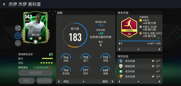 绰号“飞鸟”的奥科查是尼日利亚足坛的代表人物。创始俱乐部传奇版本奥科查配备了边路超跑天赋,对他的盘带突破以及速度优势都有进一步提升。实战中,奥科查在边路的进攻相当出色,能传能突,表现全面。