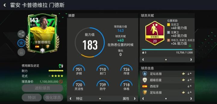 卡普德维拉是西班牙王朝的重要拼图之一。创始俱乐部传奇版本卡普德维拉配备了坚如磐石天赋,对他的防守能力提升巨大,让他攻守更加均衡。实战中,卡普德维拉攻守兼备,能上能下,边路存在感极强。