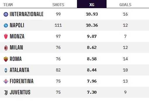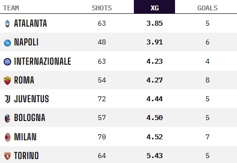 尤文的任意球预期进球比高达29%,排在意甲第五,也就是将近三成的预期进球是靠任意球机会获得的。这个数据可以在两个方面去理解:1,尤文把握任意球的机会非常强;2,尤文在阵地战进球的能力不是太好。大家看一下排在尤文前面的四支球队,可能可以得出自己的判断。