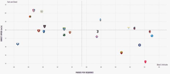 从两个维度来可以来看进攻的风格:横轴是每次进攻传球的平均次数,纵轴是往前推进的速度。从这个图表可以看出,尤文的推进速度属于居中,和米兰,那不勒斯接近,比国米稍快;但是传球次数要大大少于这几支球队。