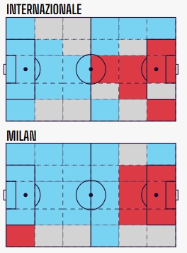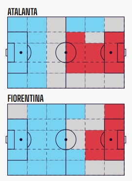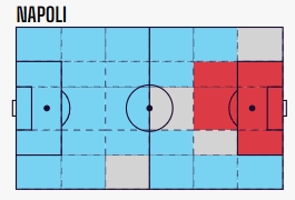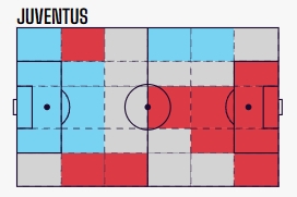 上图是尤文控球的数据分析,蓝色的是我方占优的区域,红色的是对方占优的区域。由于科斯蒂奇以及基耶萨以及某场比赛的坎比亚索的关系,尤文在左翼进攻占据优势,但是两肋的防守非常吃力,一般都是对手拿到了主动权。