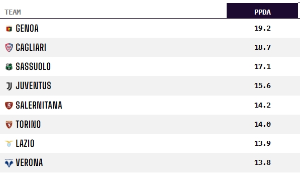 尤文并没有特意强调高位逼抢,从数据上很明显能看出来。PPDA这个数据讲的是平均允许对手多少次传球才有己方的抢断介入。在这个可以说明主动压迫的数据上,尤文排在意甲倒数第四位。看看这个表格上的其他球队,基本上都是由着对手传球。