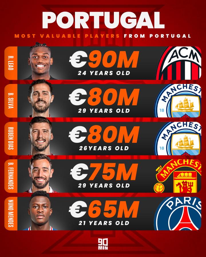 最有价值的5名葡萄牙球员,C罗没有出现在榜单中 ...FootballNoble @懂球帝2023-10-14 16:32最有价值的5名葡萄牙球员,C罗没有出现在榜单中 💰 其中AC米兰的莱奥以9000万欧元的身价排名第一; 来自曼城的席尔瓦和鲁本·迪亚斯以8000万欧元的身价排名紧随其后; 来自曼联的B费和巴黎圣日耳曼的努诺·门德斯分别以7500万欧元和6500万欧元排名第4、5位。展开更多