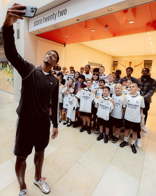 几周后,贝林厄姆出现在家乡伯明翰的一家“快闪店”(pop-up shop, 快闪商店,指在短时间内开张的一种商店,在欧美流行),向当地孩子们免费发放了数百件2023-24赛季的皇马球衣。