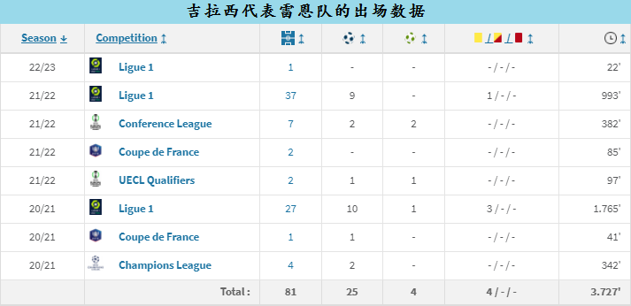 21/22赛季初,雷恩从蒙彼利埃以1500万欧元的转会费引进了27岁的法国中锋拉博德,遭遇伤病困扰的吉拉西在该赛季的队内竞争中并没有获得时任主帅热内西奥的信任,整个赛季仅有7次首发出场,但该赛季9个法甲进球的表现依旧高效。