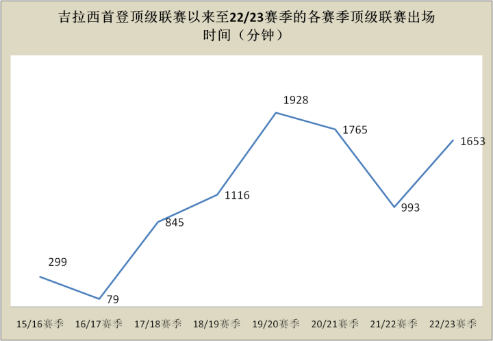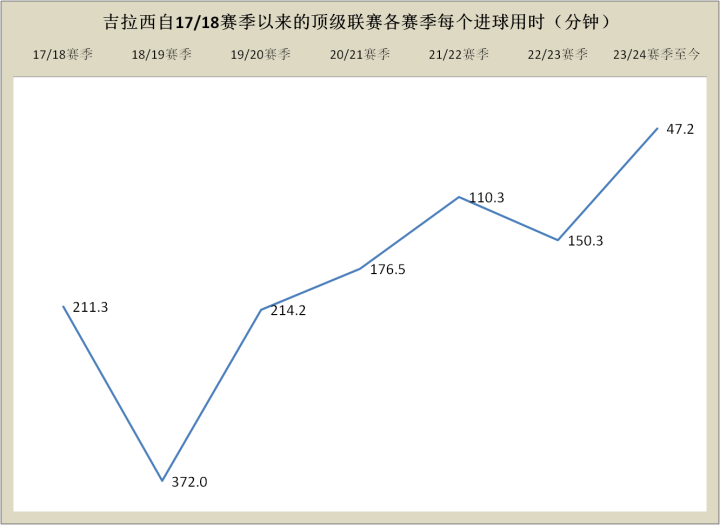 在本赛季之前,吉拉西进球效率最高的赛季是21/22赛季,该赛季吉拉西每个进球耗时仅110.3分钟。