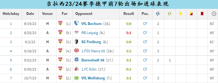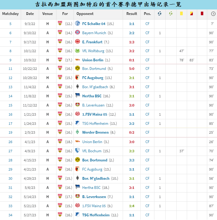 22/23赛季,吉拉西在德甲联赛中出场22次,打进11个进球,帮助球队获得了联赛第9的不错成绩。