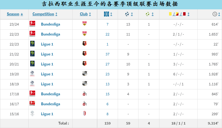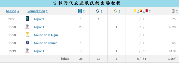 27次出场,10个进球和1次助攻的表现让吉拉西成为了该赛季队内的联赛头号射手,同时吉拉西也连续两个赛季在法甲参与进球数超过10个。