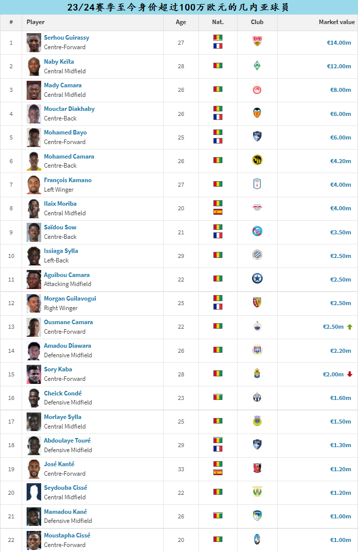 目前身价1400万欧元的吉拉西也超过了身价1200万欧元的前利物浦中场纳比-凯塔,成为目前身价最高的几内亚籍球员,吉拉西和凯塔也是目前仅有的两名身价超过1000万欧元的球员。而目前身价超过100万欧元的几内亚球员达到了22名。